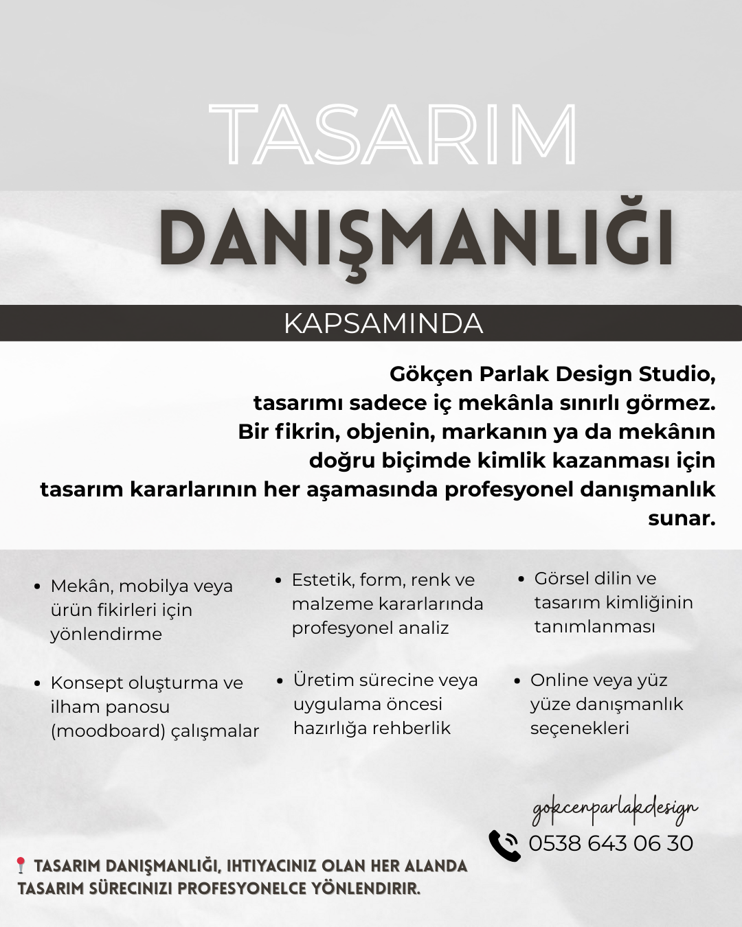 Gökçen Parlak Design Studio olarak, iç mimarlık ve tasarım danışmanlığı alanlarında online ve yüz yüze yaratıcı tasarım çözümleri sunuyoruz.